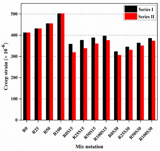 The creep strain of various GPC mixes was measured at the age of 90 days and are presented in Figure 13. The final creep strain was the average creep strain of three identical specimens. Table 9 shows the percentage change in creep strain of mix Series I and mix Series II with respect to the creep strain of mix R0. It can be seen from Figure 13 that the creep strain increased for both the series with an increase in RCA% in GPC. The minimum value was obtained for the mix R0 (412 × 10−6), while the maximum value was identified for the mix R100 (502 × 10−6), out of all the GPC mixes. It indicates that an increase in RCA% leads to higher deformation due to creep. On the other hand, the addition of UFS in GPC was beneficial, as it decreased the creep strain for all the mixes. In general, mixes of Series II showed lower creep than mixes of Series I. The maximum decrease in creep was found to be 25.7% for the mix R0S30.