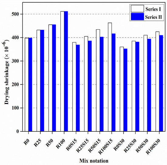 Moreover, the mixes of Series II showed lower drying shrinkage in comparison with mixes of Series I; although, the difference was less significant. The largest increase in drying shrinkage was observed for the mix R100S15 (16.3%) of Series I, while the largest decrease in drying shrinkage was identified as the mix R0S30 (11.5%) of Series II. In this case, pore size distribution (total porosity and average pore diameter) is the critical factor that affects the drying shrinkage of GPC. Large pores were formed due to RCA addition [46], which altered the pore distribution in the matrix and led to higher drying shrinkage. However, UFS acted as a filler primarily and then as an active precursor, which formed the reaction products, such as CSH, CASH and NASH.