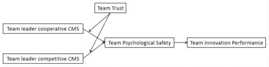 In addition, team trust refers to a kind of consensual perception; that is, team members are willing to accept the vulnerability of others and have an active expectation for the credibility of colleagues’ behaviors and intentions [22,23], which is a typical factor contributing to team climate shaping. Edmondson [24] propose that trust between team members is closely related or complementary to members’ psychological safety, and Oh et al. [25] also prove that trust positively affects psychological safety. Some other scholars introduce team trust as a moderating variable in team studies [26,27,28,29]. In view of the significant effect of team trust in managing TPS and building team climate, this paper will investigate how team trust moderates the relationship between team leader’s CMS and TPS.