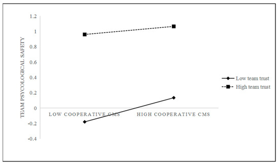 Secondly, this paper shows that team trust weakens the effect of team leaders’ cooperative CMS on team psychological safety, it is against our hypothesis. Possible reasons are as follows. On the one hand, leaders have a critical effect on the team and their behaviors are important to shape team psychological state. Zhang [62] (2009) demonstrates that, compared with favorable circumstances, leaders are more able to play a key role in adverse circumstance. It can be deduced that when team trust is low, meaning that the circumstance is rather adverse, a team leader’s behavior will have a stronger impact on the team psychological state. On the other hand, there is less space for team leaders to improve team psychological safety since the latter has been at a higher level in the case of high rather than low team trust.
