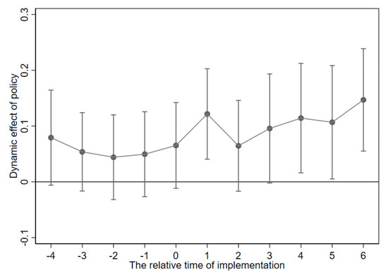 Table 6 presents the results of the regression for the PSM-matched sample. The results show that the regression coefficient of is significantly positive, which is similar to the results of the benchmark regression. It indicates that the low-carbon pilot city policy has a promotional effect on corporate green innovation. It further supports the research hypothesis of this paper.