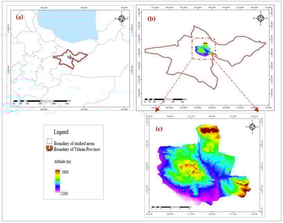 Location of the study area in (a) Iran, (b) Tehran province, (c) the “Jajrud Protected Area with the Sustainable Use of Natural Resources”.
