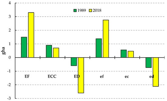 In the study area, EF increased from 1.5 gha in 1989 to 3.3 gha in 2018, while ECC decreased from 0.9 gha in 1989 compared to 0.7 gha in 2018 (Figure 3). ED also increased from −0.6 gha in 1989 to −2.6 gha in 2018. At the per-capita level, ef has risen from 1.38 gha in 1989 compared to 2.75 gha in 2018 (whit average annual = 4.23%), while ec has decreased from 0.56 gha in 1989 compared to 0.47 gha in 2018. As the results demonstrate, ed has also increased from −0.74 gha in 1989 to −2.12 gha in 2018.