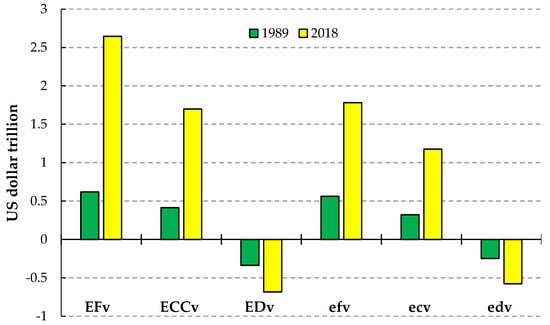 Proportions (%) of value quantities of EF in various accounts (1989 vs. 2018).