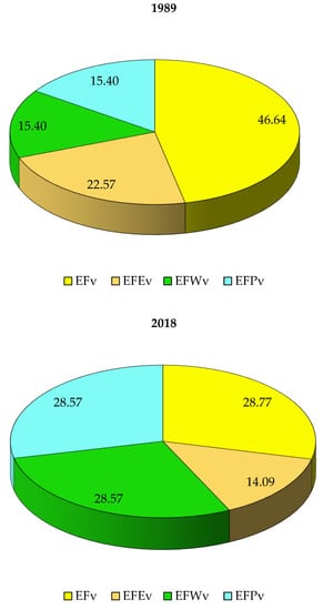 According to Figure 5, due to the increase in the price of biological resource products and increased human demand, the highest total EFv applies to the EFB, followed by the highest value for the EFE. The total EFv ratio has increased from 34.87% in 1989 compared to 54.32% in 2018.