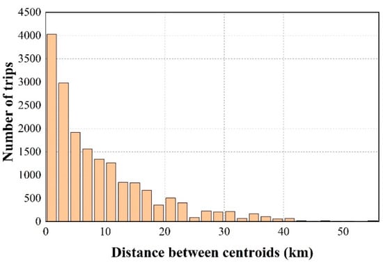 In order to obtain sample data on the travel characteristics of Wuhan residents, the sampling method used was mainly in the form of a questionnaire. The work started in March 2021 and lasted for one year. A research team of more than ten people conducted a large number of investigations through a combination of online network push and offline field distribution. A total of 9010 valid questionnaires were collected, including respondents’ OD (Origin-Destination) data on their daily travels after the outbreak, the main mode of transportation for daily travels and household financial income. The online questionnaire was distributed based on the Credamo platform, a questionnaire distribution system with more specialized functions, which grids the respondents by restricting their IP addresses, and embedded the option of geographic coordinates in the questionnaire, so that the daily OD data of the respondents could be extracted directly. This compensates for the inefficiency of offline questionnaire distribution and the tendency to concentrate respondents in different areas. In addition, the geographic data such as administrative divisions and road networks in this manuscript are sourced from the Gaode open platform, a system of open map data services, and vectorized based on ARCGIS 10.7. According to the survey results, for the residents’ daily mode of transportation, the number of people who chose to walk is 883, the number of people who rode is 1165 (including bicycles, electric vehicles and motorcycles), the number of people who took the bus is 1268, the number of people who took the subway is 3973, the number of people who travelled by car is 1649, and the number of people who traveled by other means was 72. In Rastogi R’s research on non-motorized mode as a sustainable transportation option, it is believed that controlling the travel distance within 5 km will be more conducive to achieving sustainable and healthy travel modes [33]. From the distribution of the daily OD distance of all respondents, it was seen that 49.56% of the respondents had a daily OD distance of less than 5 km, indicating that the residents had a high potential for non-motorized travel in Wuhan (Figure 2).