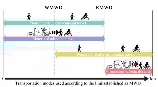 Caprì S., Stamos I. and Krumdieck S. [29,30,31] classified urban residents travel by necessity and degree of impact, on the basis of which this paper analyzed the feasibility of non-motorized alternatives and the maximum distance travelled in such situations, assuming that motorized travel may be restricted to varying degrees during sudden disasters [34]. The concept of MWD (Maximum Willing Distance) for residential non-motorized mode travel was proposed to represent the maximum distance that urban residents would ideally be willing to walk or cycle, where WMWD and RMWD can be used to represent the maximum willing distance for walking and cycling respectively.