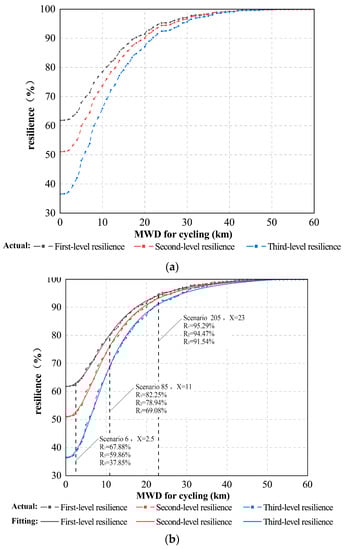 Curve of change in citywide integrated transportation resilience levels for different RMWD values. (a) is the curve of the actual result; (b) is the fitted curve.