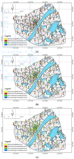 As a result, Wuhan residents’ travel was divided into four modes, including non-motorized conventional travel, non-motorized over-distance travel, motorized adaptable travel and motorized non-substitutable travel (Figure 4). Non-motorized conventional travel indicated that residents’ daily travel distances were within their respective MWD, i.e., daily travel distances were less than both WMWD and RMWD. Non-motorized over-distance travel referred to a specific group of people who, due to individual factors, chose to walk for distances outside their WMWD, and walk or cycle for distances outside their RMWD. This group of people were less likely to be affected by the suspension of urban motorized transportation, despite the fact that their non-motorized travel distances were further than the general population. Motorized adaptable travel indicated that residents chose to travel by motorized means despite their daily travel distance being within the MWD, and therefore can also switch from motorized to non-motorized travel when motorized transportation was out of service due to the short travel distance. In contrast, motorized non-substitutable travel meant that the distance travelled exceeded the corresponding MWD and cannot be replaced by non-motorized means such as walking or cycling, so that travel cannot be completed when motorized transportation was shut down due to sudden disaster shocks.