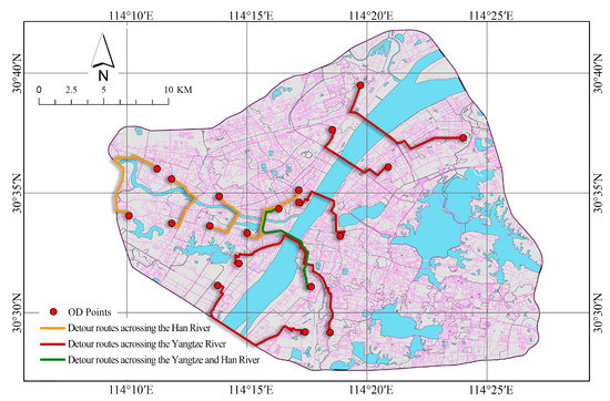 In addition, when the RMWD was low, at 2.5 km, the proportion of motorized non-substitutable travel in the downtown was close to the proportion in urban periphery regions, both at the similarly high level. When the RMWD was increased to 11 km and 23 km, the proportion of motorized non-substitutable travel in the downtown decreased significantly compared to the urban periphery regions. This suggested that residents of the downtown were more likely to shift to non-motorized travel as the RMWD increased, while there was more resistance to shift in urban periphery regions. It also meant that a relatively large number of residents in the downtown of Wuhan still travelled more than 2.5 km daily and chose to travel by motor vehicle. Further analysis of the OD data for this type of resident showed that most of them had traffic detours, which were mainly caused by the vast area of Wuhan’s waters. A large proportion of residents were bound to have more detours due to cross-river travel and were therefore unsuitable for non-motorized transportation options (Figure 8). The three towns of Wuhan, formed by the division of the Yangtze and Han rivers, boast a scattering of lakes of all sizes, so the city’s road network is not laid out in the usual circular radial pattern. The geographic center of Wuhan is located along the river, forming a cluster layout with multiple banks along the river, which made it less accessible than the cities with a centralized layout. Even parts of the city center had become “End of traffic” in a sense due to the more obvious problem of bypassing transportation along the river [38]. The geographical characteristics described above led to an inherently weak foundation for transportation resilience in the downtown of Wuhan. In addition, urban centers are generally old urban areas where buildings are dense, vehicles are congested and roads are narrow. The lack of a good slow-moving transport system will inevitably make it difficult to support residents to actively choose non-motorized modes of travel such as walking or cycling, which is also a problem of resilience in the downtown of Wuhan. Generally speaking, walking within 3 km and cycling within 5 km are ideal for human habits. It is therefore necessary to optimize urban transport facilities as much as possible to make them pedestrian-friendly and cycling-friendly. This will promote the conversion of some motorized non-substitutable travel to non-motorized travel, ultimately increasing the resilience of urban transportation in the event of a sudden disaster.
