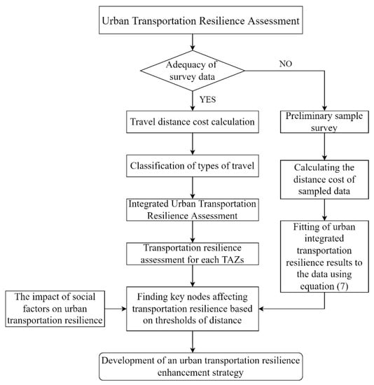 As an essential part of the urban system, urban transportation is key to the proper functioning of cities. Shocks from sudden disasters such as COVID-19 could lead to changes in the city’s transportation demand and supply. For example, the growth of passenger and freight demand is slowing down and the constraints of the newly invested resource elements are increasing, etc. Therefore, it is very important to establish the integration of urban transportation, which presupposes the integration of infrastructure, passenger transport services, and the integration of the transport communication and information support guarantee system of heaven and earth. The urban transport resilience assessment methodology presented in this manuscript can lead to improved urban transportation integration in areas such as infrastructure and passenger services, and can help to address problems in transportation supply and demand. The use of the urban transportation resilience assessment method in this study can refer to the process of Figure 10. This method can help managers quickly and accurately explore the key nodes that affect the improvement of transportation resilience.