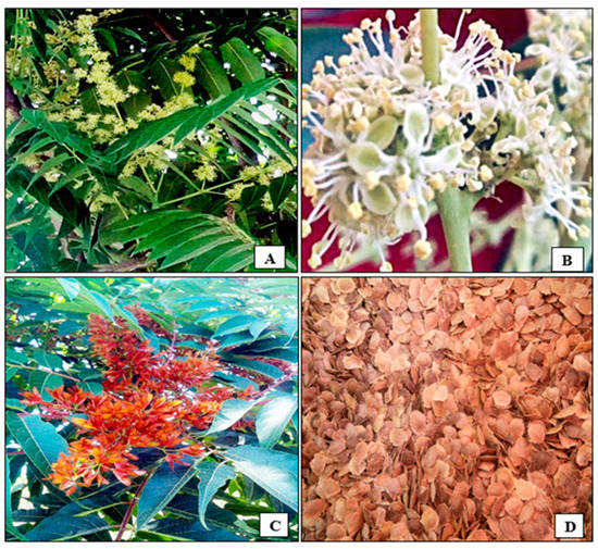 (A) Flowering branch of Ailanthus altissima, (B) flower, (C), pods, (D) seeds that have been peeled off.