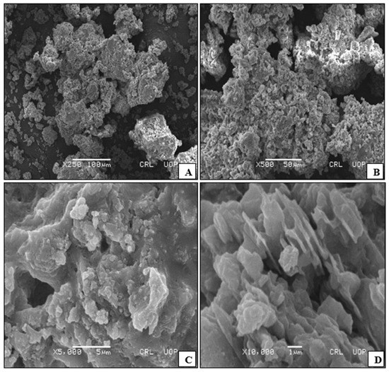 SEM images of KAC at different magnifications (A–D).