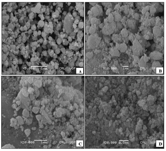 The surface morphology of potassium hydroxide (KOH)-activated Ailanthus cake (KAC) was analysed via scanning electron microscopy (SEM), as shown in the Figure 2. The visible SEM images taken at different resolutions depict the morphology of the KAC, which appears to be irregular in shape, having hollow small cavities that, along with macropores, correspond to making the surface porous. The micrographs have a spongelike, fluffy appearance may aid in the increase in catalytic activity. Additionally, the micrographs of CdS were also investigated: fine particles were found in a regular pattern, as shown in Figure 3.