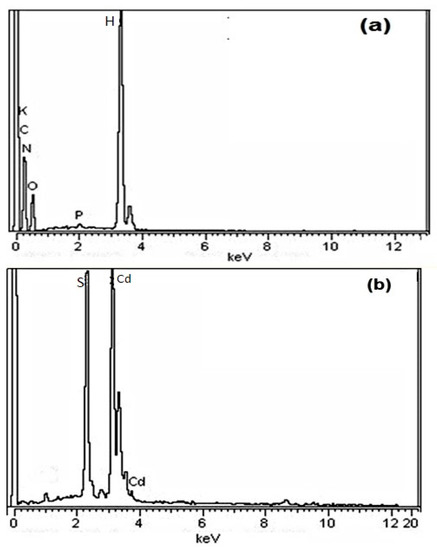 The energy dispersive X-ray (EDX) results show the elemental composition in the prepared catalysts (KAC and CdS) (Figure 5a,b). As the catalyst is activated by potassium, the high percentage of 32.18% (wt.%) was observed along with carbon (27.7 wt.%) and oxygen (34.7 wt.%) as major elements. The EDX spectrum of CdS revealed the presence of only two elements in the compound: i.e., cadmium and sulphur with 72.34 and 27.30 wt.%, respectively. The EDX results depicted that the nanoparticles consisted entirely of cadmium and sulphur, thus establishing the purity of the particles.