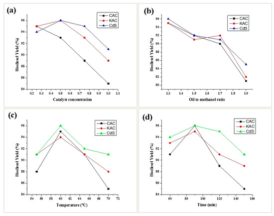 As high yield of methyl ester with efficient conversion of oil to biodiesel was observed at adequate time in the course of the trans-esterification reaction, therefore, an appropriate reaction time is required to ensure efficient mixing with proper stirring at constant rate for suitable chemical interaction of oil and alcohol during the trans-esterification reaction. With both catalyst KAC and CdS, the maximum yield of biodiesel was achieved at a reaction time of 90 min with all the other variables constant. A slight difference of biodiesel yield was observed with an increase in time; however, 90 min was selected to give sufficient time for reaction completion (Figure 6d). During the trans-esterification reaction for each type of catalyst, the minimum time required for the conversion is usually 25–30 min. Hence, the biodiesel yield increases directly with the increase in time [18].