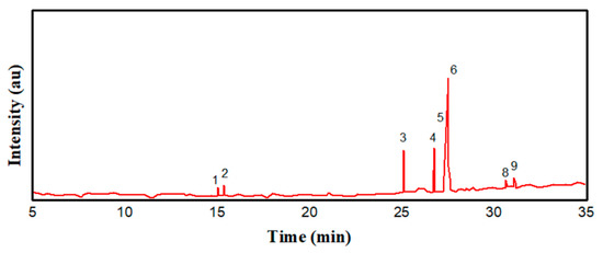 Gas chromatography is an advanced analytical technique used to investigate the chemical composition of the synthesised biodiesel (AAOBD) by using a capillary column DB-5MS (30 m, 80.32 mm and 0.25 micron film thickness), helium (He) as carrier gas at 1.5 mL/min flow rate, column temperature 120–300 °C at 10 °C/min and 0.1 L sample, which was injected in split mode (1:10). The characteristic four peaks were found along with retention time, as shown in Figure 8, which corresponds to the formation of fatty acid methyl esters (FAMEs). The most frequent esters in synthesised biodiesel are octadecenoic acid, hexadecanoic acid and 2,4-decadienal methyl ester.