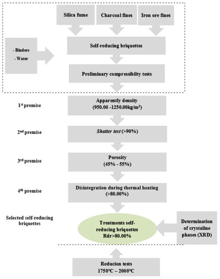 The knowledge of the structural resistance behaviour of the self-reducing briquettes was a prerequisite for the selection and eligibility of the briquettes. The structural resistance may also be linked with the kinetic and thermodynamic conditions that would promote the self-reduction [,,,,,,]. Figure 2 shows the methodological flowchart with the experimentation tests and analyses to which these agglomerates were submitted. The lower range was stipulated for each experimental test and this criterion was considered as a selection filter of the treatments that would be submitted to the subsequent tests.