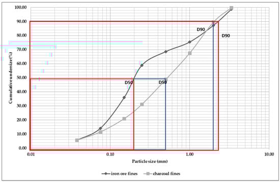 Particle size distribution curve of iron ore and charcoal fines.