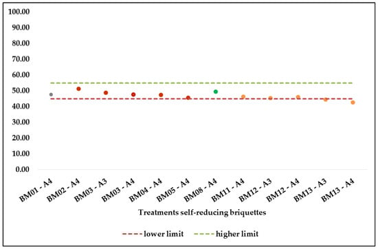 Finally, Figure 8 shows that the treatments of self-reducing briquettes with the three types of binders with a proportion of 10.00% also obtained apparent density within the stipulated range (950.00–1250.00 kg/m3). On the other hand, regarding the shatter resistance only two treatments made with Portland cement binder (BM05-A3 and BM05-A4), one treatment with hydrated lime binder (BM09-A4) and three treatments with sodium silicate binder (BM012-A2; BM012-A3 and BM12-A4) obtained a shatter resistance index above the stipulated value (R > 90%).