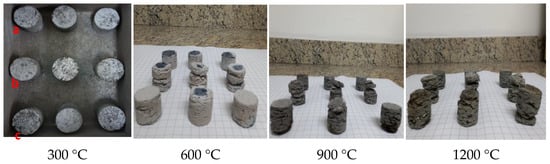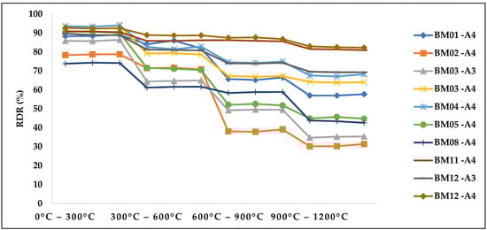 The influence of temperature on the structural integrity of the self-reducing briquettes was analysed in those treatments that met the criteria of porosity between 45–55%. The proposed tests evaluated the physical characteristics of resistance to high temperature of briquettes, in a non-standardized test []. The procedures for quantification of this test were based on the ISO 8371:2015 [] and ISO 7215:2015 [] standards. For iron ore pellets for use in reduction reactors, the crackling index test is one of the main evaluations of the metallurgical characteristics of this ore. The tests were performed in a muffle furnace, with temperature variation from 0 °C to 1200 °C in 300 °C increments. The briquettes were weighed, before and after the preheating treatment, and then sieved in a granule sieve with a 9.50 mm mesh. The resistance to thermal heating was determined as the percentage material retained in the sieve, and this size mesh was taken as a reference because it is the minimum grain size for raw material in electric arc furnaces. Equation (5) shows the calculation used for determination of the resistance to degradation (Rdr) against the thermal gradient applied to the treatments of self-reducing briquettes M1. The mass of the material retained in mesh of 9.50 mm (g) and M the mass of the initial agglomerate (g):