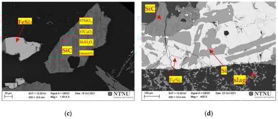 Comparing the treatment BM12-A4 (Figure 19c,d) with the phases of the treatment BM11-A4 (Figure 17), both at a temperature of 1850 °C, the phases produced were similar. In fact, when comparing the results obtained for the FeSi and FeSi2 phases, there were no strong variations in the Si, C and Fe contents. However, on the other hand, it was observed that in the slag produced in both treatments the percentage of CaO present was 30.18% for BM 11-A4 and 5.05% for the BM12-A4 treatment, which may be related to the lower proportion of 2.50% of active silica in the BM12-A4 treatment.