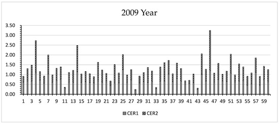 Corporate environmental responsibility reflects the degree of impact of corporate management decisions and production behaviors on the natural environment. This paper calculates the environmental input and output data of iron and steel enterprises through the SBM super-efficiency model including undesired outputs, and provides objective and effective data for the following examination of the relationship between corporate environmental responsibility and corporate performance. Due to space limitations, Figure 1 only shows the calculation results in 2009. Among them, the output variables in CER1 include the expected output variable output value of the three wastes and the undesired output variables three wastes (waste residue, waste water, and waste gas) and sewage charges; CER2 as a control group only includes the expected output variable output value of the three wastes.