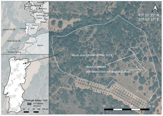The study was undertaken in northeast Portugal (41°32′ N, 7°02′ W), on a site of community interest (SIC PT CON0043-Romeu), located at an altitude of about 500 m.a.s.l. and representative of open Mediterranean forests (Figure 1). It has a Mediterranean climate, with an average annual temperature of 14.3 °C and total annual precipitation of 508.6 mm (data for 1971–2000). The vegetation is dominated by an open mixed sclerophyllous forest of Quercus faginea, Q. rotundifolia, and Q. suber, with a moderately dense shrub layer comprised mainly of Cistus ladanifer, Cytisus multiflorus, and Lavandula stoechas. The soils are classified as Distric Leptosols derived from schists.
