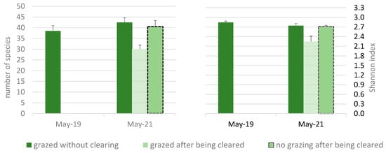 Several reasons could contribute to the fact that the grazed plot after clearing had fewer species than those not grazed or grazed but not previously cleared, as evidenced by authors who studied the effect of fuel reduction on vegetation recovery and diversity. Overall, they describe similar effects of prescribed burning, clearing, or mastication on the time of vegetation recovery and species richness [48]. A large number of studies [43,48,53,54,55,56] have reported an increase in species richness after fuel load treatments. This is the case of Peréz-Ramos et al. [52], who found a more pronounced effect two years later in an open cork oak forest, or Silva et al. [43], who also described this effect for at least four years after prescribed burning in shrublands in central Portugal. In contrast, Fuentes et al. [57] found a reduction in species richness and diversity only during a short period after prescribed burning.