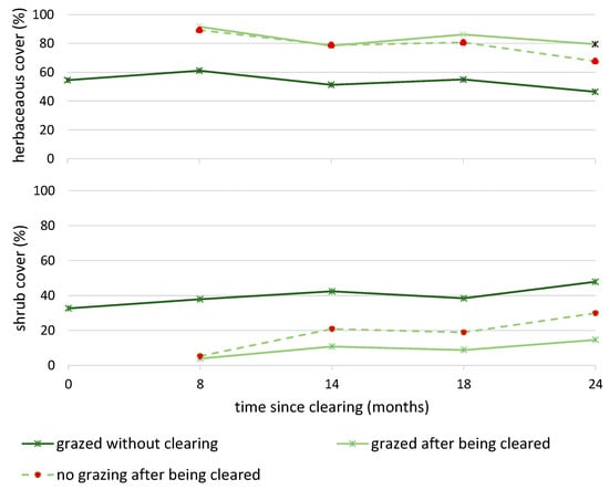 Herbaceous cover, on average, ranged from 53.71% for NCL + G and 83.90% for CL + G (Figure 3), showing a pattern of decrease over time, very noticeably in the plot treated by clearing without grazing. As expected, the percentage of shrub plant cover showed an opposite pattern, ranging on average between 39.85% for NCL + G and 9.53% for CL + G (Figure 3), being much smaller in the cleaned plots. However, 24 months after the shrub-cleared treatment, the ungrazed plot (mean ± SD: 29.94 ± 5.21%) showed a value approximately twice as high as the grazed one (mean ± SD: 14.63 ± 2.85%). In addition, it can be observed that the shrub cover evolution in the untreated plot was slow.