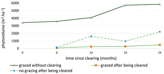 The understory phytovolume was the structural variable most sensitive to clearing and grazing effects. The post hoc test revealed that the means of the three treatments were significantly different, ranging on average between 280.17C ± 51.06 m3 ha−1 (Cl + G) and 4534.31A ± 476.52 m3 ha−1 (NCl + G), being much lower in the mechanical cutting plots than uncut ones. All plots showed increased phytovolume over time but at different rates (Figure 4). However, the temporal dynamics on the untreated plot were not significant. The woody plant layer of the treated plots without grazing (CL + NG) overgrew during the study period, reaching after 24 months since clearing the value of 2210.75 ± 481.92 m3 ha−1, approximately four and a half times the values of the grazed one (Cl + G).