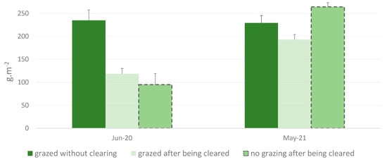 The herbaceous biomass increased between the first and the second year post-treatment in the plots under mechanical clearing. However, it was significantly higher in the ungrazed plot (mean ± SD: 264.10A ± 10.40 g m−2) in comparison with the other one (mean ± SD: 193.34C ± 16.05 g m−2). After two years, the plot without mechanical treatment showed a lower biomass value than the ungrazed plot (NCL + G. mean ± SD: 229.07B ± 9.20 g m−2). The three plots showed that biomass values significantly differed two years after shrub clearing. This suggests that mechanical clearing alone after two years does not affect the available herbaceous biomass; surprisingly, the grazed ones, even without previous treatment, have little effect on the available herbaceous biomass. The last plot showed similar values between years (mean ± SD: 234.71 ± 24.12 g m−2 and 229.07 ± 9.20 g m−2 in 2020 and 2021, respectively; Figure 5).