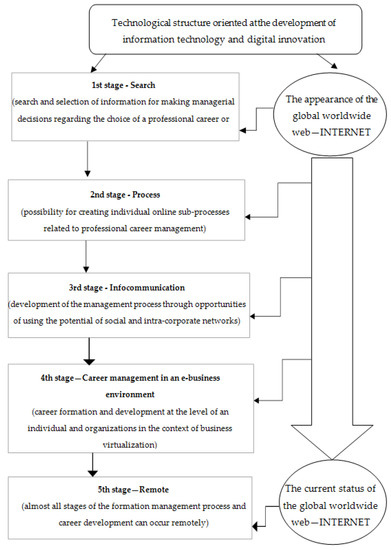 The development of innovative technologies and new opportunities in the latest generation’s information space and communication networks follows the fifth stage of evolution in Figure 1. It encourages various management entities to transition from less cost-effective, outdated career management systems to more progressive ones based on the possibility of using remote technologies.