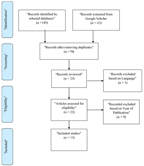 The Preferred Reporting Items for Systematic Reviews and Meta-Analyses (PRISMA) guidelines were adopted for data collection. Data were collected as per the inclusion and exclusion criteria guidelines, and initially, N = 150 searches (this included scholarly articles, and initially, grey literature) were retrieved. After that, primary screening was performed, and in the primary screening, duplicate results were removed, and N = 70 articles were passed down to secondary screening. Then, further articles were excluded on the basis of the titles/abstracts, language, and timeline, resulting in N = 25 articles. Finally, exclusion was conducted based on the quality check, and it resulted inN =13 articles for literature discussion. Figure 2 shows the PRISMA framework.