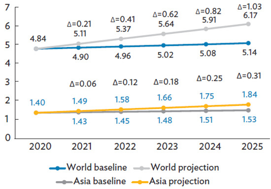 The digital economy in Asia is expected to grow further, providing opportunities to bolster economic growth, build businesses, create jobs, and address socio-economic challenges. To estimate the macroeconomic benefits of the increased usage of digital technology, a scenario that leads to a 20% increase from the baseline by 2025 was analyzed (Figure 4). This scenario represents the digital transformation during the coronavirus disease (COVID-19) outbreak, as evident from the shift to working from home, online education, telehealth, e-commerce, and reliance on digital media. Digital transformation is implemented by increasing investment in the digital sector, which contributes to the higher output of sectors that use digital inputs more intensively and raise the economy’s overall productivity. Overall, the size of the global digital sector is expected to increase by an average of roughly617 billion USD annually from baseline levels, or 3.1 trillion USD from 2021 to 2025, while the digital sector in Asia is modeled to rise by about 184 billion USD annually from the baseline to about 919 billion USD in 5 years (Figure 4). The calculations were based on the Global Trade Analysis Project (GTAP) database. Asia refers to Asia and the Pacific, and, in this case, it includes economies that are not members of the Asian Development Bank (ADB) due to the aggregation of the Pacific subregion in the GTAP. Numbers may not be precise sums because of rounding.