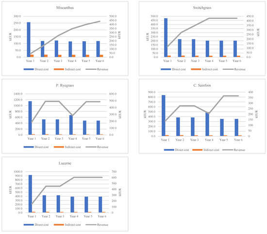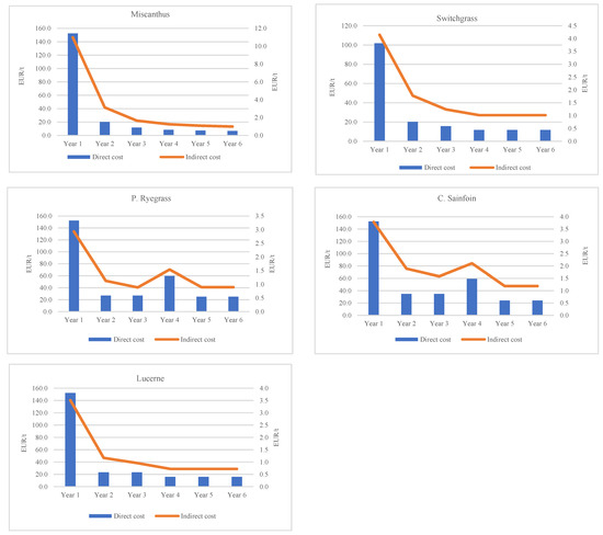 The Miscanthus production system, considered over a life cycle of 6 years, had the highest total costs, i.e., 189 EUR/ha, followed by the C. Sainfoin with 176 EUR/ha, P. Ryegrass—175 EUR/ha, Switchgrass—174 EUR/ha, and the Lucerne production system with the lowest costs of production of 169 EUR/ha.