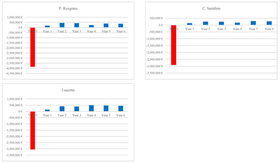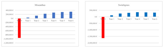 The lowest costs were observed in the case of Miscanthus and Switchgrass—255.9 kEUR (DC during the first year)—118.0 kEUR (DC during the sixth year); 18.5 kEUR (IC during the first year)—17.4 kEUR (IC during the sixth year) and 475.2 kEUR (DC during the first year)—202.3 kEUR (DC during sixth year); 19.3 kEUR (IC during the first year)—17.4 kEUR (IC during the sixth year), respectively. Direct and indirect costs of C. Sainfoin and Lucerne were 838.8 kEUR (DC during the first year)—351.8 kEUR (DC during the sixth year); 22.1 kEUR (IC during the first year)—17.4 kEUR (IC during the sixth year) and 919.2 kEUR (DC during the first year)—390.1 kEUR (DC during the sixth year); 21.2 kEUR (IC during the first year)—17.4 kEUR (IC during the sixth year), respectively. Based on the comparison of the revenue with costs covering a period of 6 years, Figure 2 shows a positive net cash flow (net benefit) generated by the perennial energy crops, Miscanthus and Switchgrass. Miscanthus provided a net benefit of approximately 681.5 kEUR, with revenue ranging from 42 to 437.7 kEUR. The revenue of Switchgrass ranged from 116.7 to 427.8 kEUR, and its net benefit was approximately 392 kEUR. The net benefit of P. Ryegrass, C. Sainfoin, and Lucerne over a 6-year period was negative: 1541 kEUR (the revenue ranged from 188.7 to 485.5 kEUR); 1282 kEUR (the revenue ranged from 138 to 366 kEUR), and 183 kEUR (the revenue ranged from 151 to 603 kEUR), respectively.