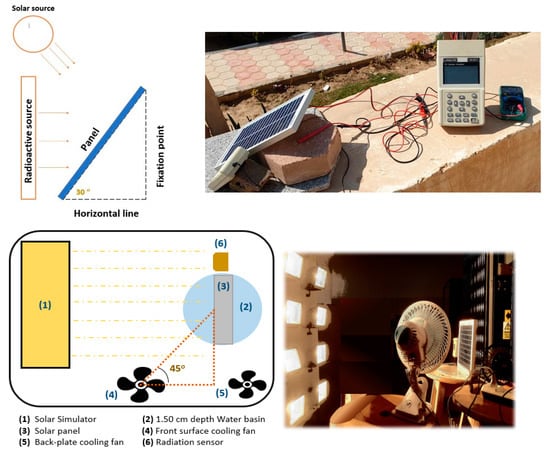 The accumulation of dust and pollutants on a cell’s surface is a serious weather condition that negatively affects the performance of PV cells and reduces light transmissivity through the solar panels. The impact of dust on PV electrical efficiency is one of the most important problems facing PV utilisation in dusty countries. Middle Eastern and North African countries are witnessing significant expansion in solar energy projects yet are challenged by environmental conditions that seriously affect the performance of photovoltaic solar energy. These environmental conditions include high summer temperature, wind, dust, clouds, and shade, which has motivated researchers to investigate techniques for overcoming the present challenges as well as taking advantage of the existing opportunities [1,2,3,4,5,6,7,8,9,10,11,12,13,14,15,16,17,18]. The reduction in PV electrical efficiency in desert areas ranges from 8.41% to 50% according to reported results [5,6,8,9,10,11]. The nature of dust (which is suspended in the air in the form of soil particles and particulate matter) follows the density of the type of land that passes through it, humidity, wind deviation, and air altitudes. The intensity of the dust increases as the sun’s surface warms and wind speed increases. These factors are changeable with different locations and, thus, dust accumulation effects differ from place to place [3,4,5,12,13]. Studies have shown that most of the photovoltaic installations in desert areas suffer from loss in electrical efficiency due to the accumulation of dust, airborne dirt, and sand particles from sandstorms, as well as high temperature in the summer season.