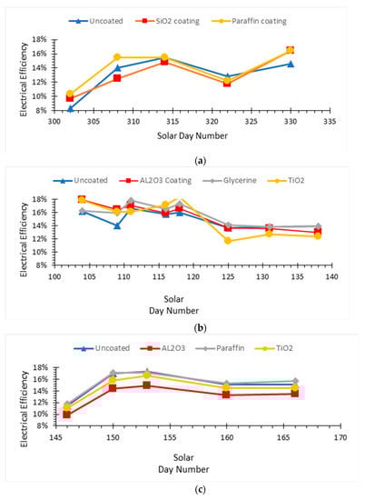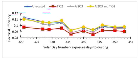 Glycerol was used as the host matrix for this stage with Al2O3 and TiO2 nanoparticles. Four different panels were installed outdoors fixed at a tilt angle of 30° in a location with a latitude of 30.144212 and a longitude of 31.639718. The experiments were conducted throughout the 2 months of November and December, which only affected the dusting conditions, as the measurements were made indoors under controlled radiation conditions. The panels were left outdoors in natural environmental soiling conditions. In these experiments, the electrical efficiency was measured under controlled simulated radiation conditions equivalent to 520 W/m2. The results are shown in Figure 3. The results show that the changes in the measured efficiencies were limited at the beginning of the experiments (when the coating was newly applied), probably because of a decline in the light transmittance after coating. However, when the panel became soiled over time, the coated panels showed slightly higher efficiencies (rise from 10 to 11%). The lowest electrical efficiency was observed when TiO2 was used alone (coating 1), while the highest electrical efficiency was measured when Al2O3 and TiO2 were used (coating 3). This may be owed to the high optical band gap of TiO2 in the ultraviolet region, which reduces its ability to capture enough energy required to activate the photocatalytic effect that could later degrade the organic dust. Improvement was achieved when alumina Al2O3 with high composition was added to the TiO2, as it reduced the optical band gap, which resulted in a good photocatalytic effect [45,46,47].