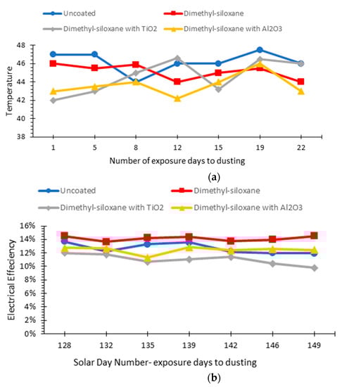 (a) Temperature for uncoated and coated panels with dimethyl-siloxane. (b) Electrical efficiency.