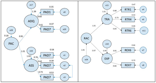 - Observed variables; the set of observed variables of the model is made up of: PAD1, PAD7, PAS1, PAS2, PAS10, RTR1, RTR4, RTR6, REX6 and REX7.
