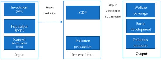 Eco-efficiency, initially described by Schaltegger and Sturm [9], is the ability to produce goods and services while minimizing inputs including natural resources and negative environmental impacts [10], and has been thought to be a good attempt to reflect the performance of urban development. Data envelopment analysis (DEA) has attracted great attention based on a total-factor production process to measure eco-efficiency [11]. However, in the context of urban development, there are weaknesses in the conventional DEA model that cannot be ignored. First, urban sustainability is a systematic process with a variety of both desirable and undesirable indicators in multiple stages of development. Overlooking the internal structure, conventional DEA models usually treat such systems as “black boxes” and do not explicitly consider undesirable indicators. Second, previous studies have generally evaluated eco-efficiency as a single process, focusing on the industrial sector, which directly generates waste, while omitting the fundamental role of government [12]. The government sector is significant, as it provides public goods and services for a sustainable production environment. How the government sector affects the industrial sector and how it allocates outputs in the production sector, as well as the efficiency in different stages, is still unknown. These facts and studies motivated us to use advanced DEA models to assess urban sustainable development, especially by revealing the internal relationship between the “black box” of urban construction and social welfare benefits.