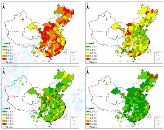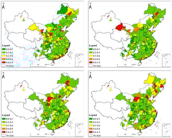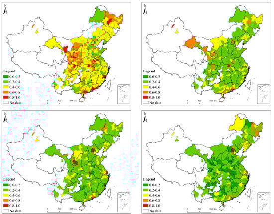 Summarizing both steps, the process efficiency of urban sustainable development could be calculated using the given algorithm. The results of eco-efficiency analysis are presented in Figure 4. It can be seen that in the second stage, most Chinese cities experienced a decline in efficiency, the most significant of which is evident in the western and interior regions. Eastern and coastal cities also have decreased their efficiency to some extent, while most developed and promising municipalities such as Beijing, Shanghai, Guangzhou, and Shenzhen still retained high standards of eco-efficiency over time, especially in the 2010s.