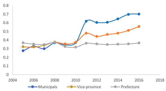 In Figure 5, the economic growth sub-efficiency levels of the cities in different administrative levels remain almost the same in the first half of the period, while showing significant differences compared to those of prefecture cities in the second half of the period, which had an even higher economic growth sub-efficiency level at the beginning. However, in the second half of the period, cities with higher administrative levels performed better than cities with lower levels, confirming the economic growth efficiency in Chinese cities of various administrative levels. Prefecture-level cities did not make any improvement on efficiency during the observed period, while the efficiency values of the municipalities and vice-provincial cities in 2016 were almost double the efficiency values in 2005.