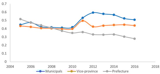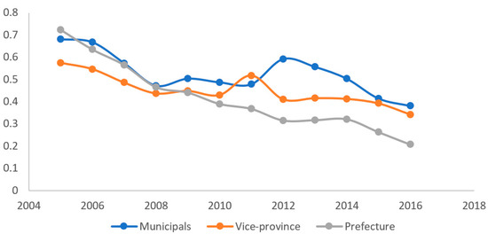 As for the sub-efficiency values of the second stage, Figure 6 shows that the cities at different administrative levels all experienced dramatic declines during the whole period, while cities with higher administrative levels still performed better than the prefecture cities at the end of the observation period. Municipalities and vice-provincial cities even realized some rebound during the years of 2011 to 2012. Prefecture cities were in the first place among the three administrative levels initially but ended up in third place in 2016, the end of our observation period. These two sub-efficiency coefficients led to the final and combined eco-efficiency result, which is presented in Figure 7, and it can be described as the combination of the results of both steps. Thus, cities with higher administrative levels showed significant advantages, which were mainly revealed in the second decade of the 21st century. This administrative advantage did make a great difference regarding the urban sustainability levels of the Chinese cities.