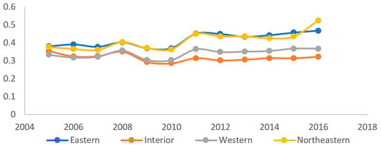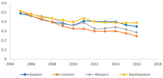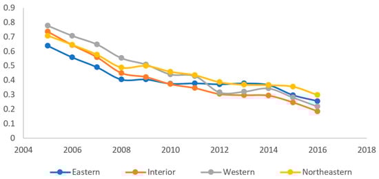 Figure 8, Figure 9 and Figure 10 show the population weighted average efficiency values of the cities in different Chinese regions during our observation period. There are significant differences among regions in terms of the sub- and eco-efficiency perspectives, and the regions took different paths during the 16 years. Interior and western cities showed some fluctuation during the 12 years but experienced little change without any advance overall. On the other hand, the northeastern and eastern cities had a relatively higher starting point in step 1 and widened their advantage over the interior and western cities during the observation period. For step 2, the sub-efficiency values of all four regions were declining, while these two regions started at a relatively low standard among the four regions but also ended up with the top two places in 2016, indicating that eastern and northeastern cities were also performing more efficiently while utilizing their economic outputs to carry out urban construction. According to the results, eastern and northeastern cities showed higher combined eco-efficiency levels at the aggregate level at the end year, and their advantage seemed to expand in the later years, which might be mostly due to their performances in the economic efficiency section. Starting from the last rank, the eastern area became one of the regions with the highest efficiency by the end of 2016. It is well known that unbalanced regional development has become an issue that is receiving increasing attention in China. The government made great efforts and attempts to promote development in the central and western parts of the country by introducing preferential policies and devoting significant resources. However, our calculations indicate that the efficiency levels of these regions continue to lag behind, and these gaps seem still to be widening in recent years and could do so even in the future.