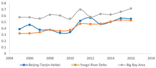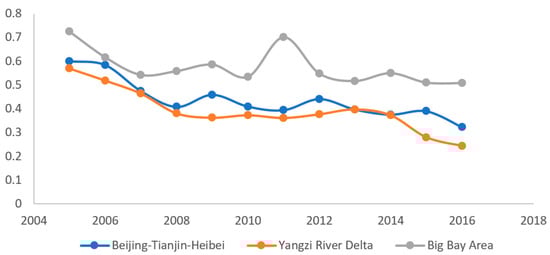 Figure 11, Figure 12 and Figure 13 present the population weighted average results of the eco-efficiency and sub-efficiency calculations of the cities in the three largest clusters. It can be observed that the Guangdong–Hong Kong–Macao Greater Bay Area had the highest level of development and efficiency on urban sustainability among these three city groups and among all of the 13 Chinese city groups in terms of both economic growth and urban sustainable construction. Regarding the economic growth process, although there was some fluctuation around 2011, all three city groups still improved the efficiency of their economic development at the end of the observation period compared to the beginning of 2005. The second step and the combined eco-efficiency figures presented a similar condition, with the Big Bay Area being the most efficient group and the other two at almost the same level. We should also point out that these city groups were the top three according to our results and comparisons.