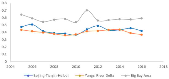 There is another trend that should be stressed regarding Chinese urban development, which is that the central government has been making a great effort to promote the formation and development of city agglomeration. The central government has approved development plans for more than 10 national-level city groups since 2018, and these covered more than 50% of the cities in our sample and more than 80% of the national population. Therefore, it is important to analyze the eco-efficiency results obtained from the perspective of city groups and clusters. Since there have been more than 10 city groups under planning, we chose the three largest and most important city groups in our sample (Beijing–Tianjin–Hebei, Yangtze River Delta, and the Guangdong–Hong Kong–Macao Greater Bay Area) to compare their eco-efficiency and sub-efficiency results.