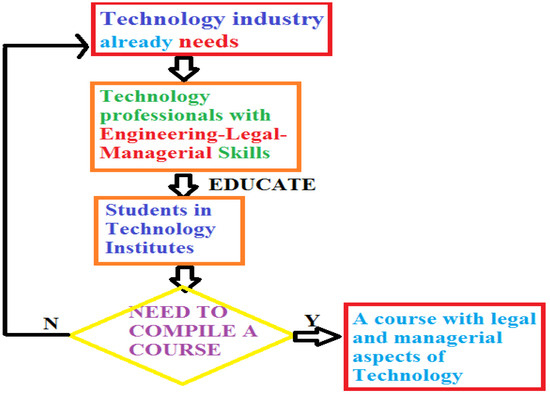 Observing the rapid evolution of technology with the corresponding security issues [1,2] that bring about the advancement of technology and the integration of technology into society [3], through business, transactions, sciences [4], products [5], and daily life, as well as observing the requirement of the Industry of Technology to occupy technology professionals who take decisions led by their legal and managerial skills, we realize that the education of computer science students in the legal and entrepreneurial aspects of technology, is generally crucial, see Figure 1.