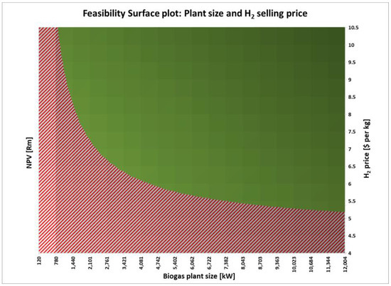Feasibility region plot indicating the hydrogen price at various biogas plant sizes.